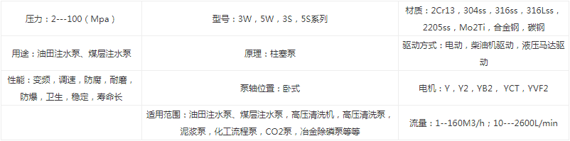 適用范圍: 油田及礦場注水泵、超高壓泵、噴射泵,除鱗泵、高壓清洗泵,加濕泵,噴霧泵,流程泵、稠漿泵、泥漿泵、液態(tài)二氧化碳泵、洗滌劑料漿泵、化工泵、液壓泵、輸油泵,海水泵等專業(yè)用泵。 特 點(diǎn): 該泵吸收國內(nèi)泵業(yè)之精華,設(shè)計(jì)先進(jìn)、結(jié)構(gòu)緊湊、體積小、泵效高、運(yùn)行平穩(wěn)、安全可靠、操作簡便、產(chǎn)品制作精良、外形美觀。每個品種的泵都有安全調(diào)壓閥,泵壓可以任意調(diào)節(jié),并有油溫、壓力、自動保護(hù)。 結(jié)構(gòu)型式:固定式、移動式 泵體結(jié)構(gòu):臥式、立式 傳動型式:電機(jī)或柴油機(jī),變速型式:皮帶、齒輪、電磁調(diào)速、變頻速、 主要零部件:機(jī)座(材料HT250);泵體(材料:316、1Cr18Ni9Ti、2Cr13、 碳鋼化鍍鎳-磷合金防腐層)經(jīng)熱處理,避免疲勞破裂;曲軸(材料:35CrMo、42CrMo)經(jīng)調(diào)質(zhì)硬氮化處理、強(qiáng)度大、硬度高、耐磨耐用;柱塞(材料:超性陶瓷、噴焊鎳合金Ni60耐磨耐腐層);盤根密封(采用進(jìn)口芳綸或碳素纖維)。 閥組型式:錐閥、平板閥、組合閥等。經(jīng)特殊處理,耐磨耐用。